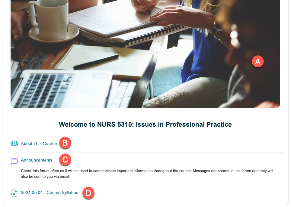 The “Start Here” section is located at the top of the course, and is intended to welcome students to the course and help them get oriented. It includes the following components that will need to be edited: