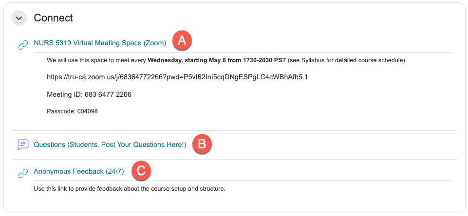The “Connect” section is a place for students to connect virtually and post questions. It includes the following components that will need to be edited: