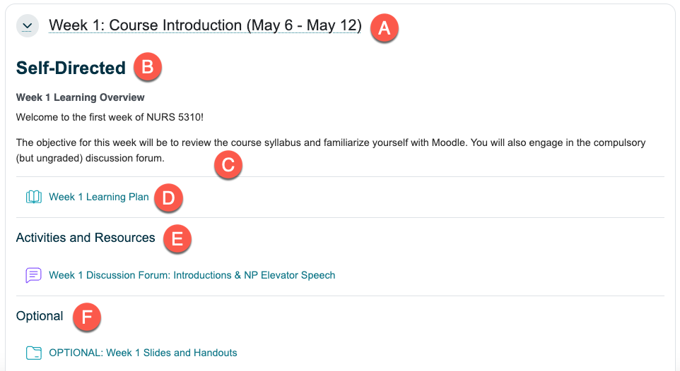 In each week of your Moodle course, you will see a consistent structure that contains the following elements which will need to be edited:
