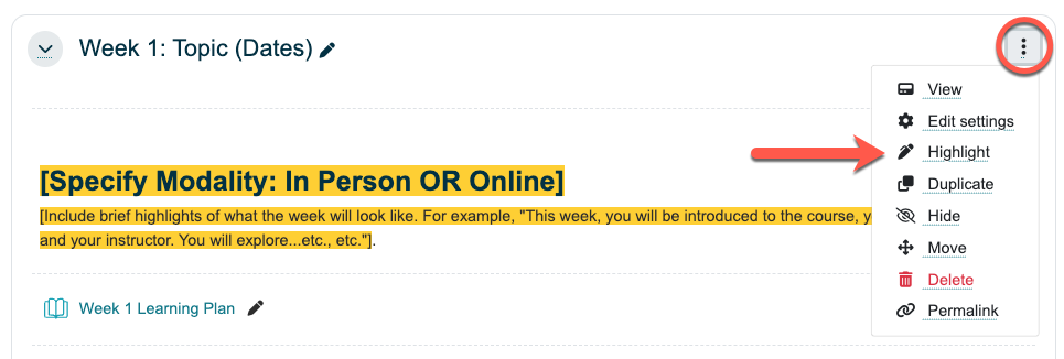 - Click the three vertical dots to the right of the course section